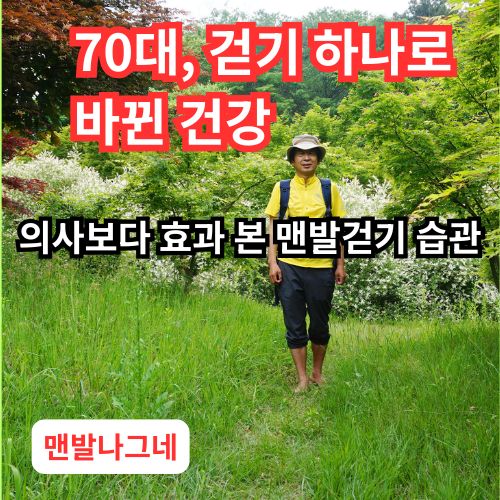 70대의 몸은 크고 작은 신호를 보냅니다. 혈압, 당뇨, 관절… 어느 날은 무릎이, 또 어느 날은 어깨가 말을 걸어옵니다. 예전 같으면 약을 챙기고 병원 예약부터 했겠지만, 이제 저는 땅 위를 걷는 시간을 먼저 떠올립니다. 그 날 이후 병원 가는 횟수는 눈에 띄게 줄었고, 맨발 걷기는 제게 고요한 명상이자 가장 값진 치유가 되었습니다.